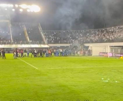 Jogadores do Santos correm para o vestiário fugindo de bombas vindas da torcida