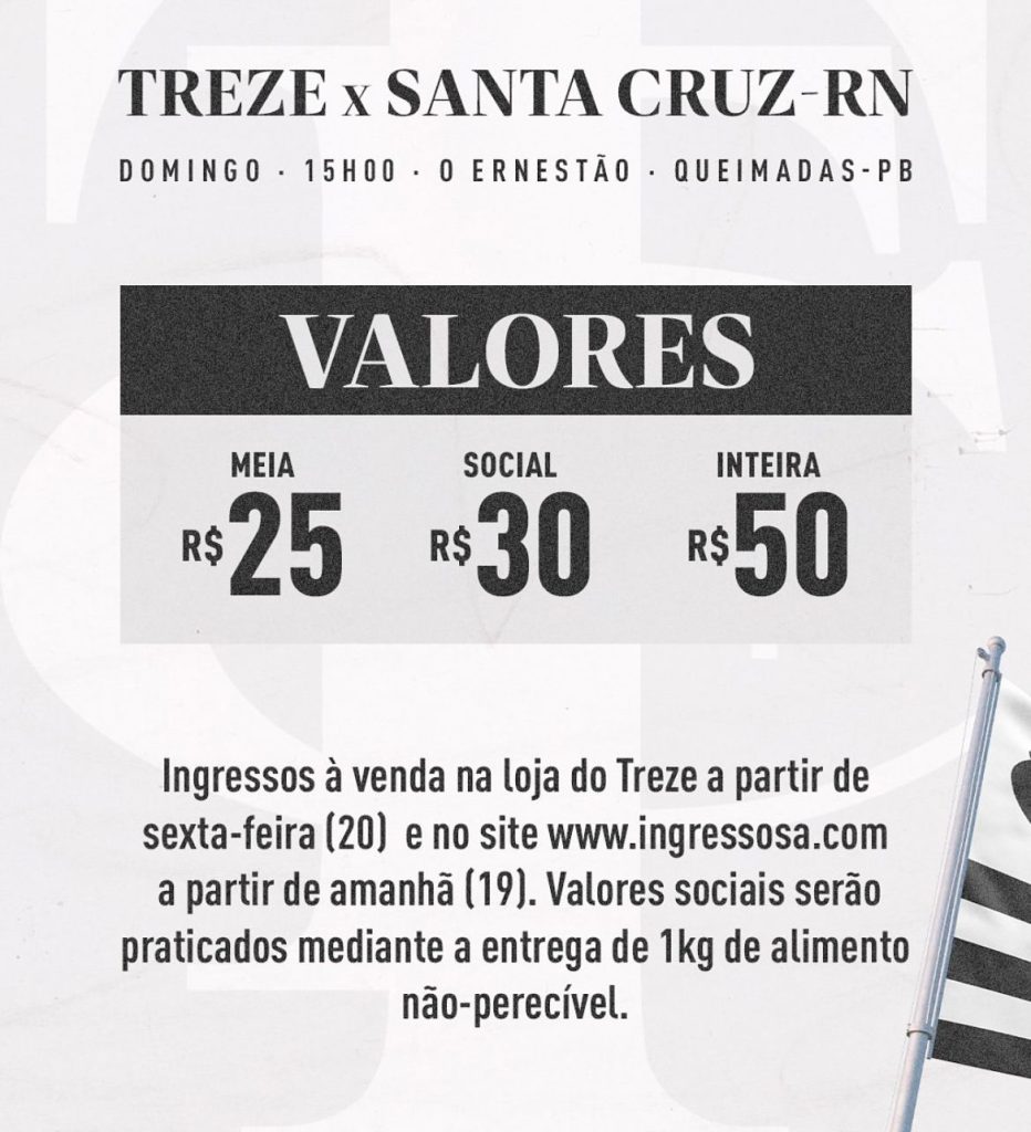 O Treze divulgou os valores dos ingressos para o amistoso contra o Santa Cruz-RN. A partida está marcada para neste domingo (22), às 15h, no Estádio Municipal de Queimadas – Ernestão. Os bilhetes custarão R$ 50 (inteira) e R$ 25 (meia). Além disso, serão comercializados ingressos sociais no valor de R$ 30 + 1KG de alimento não perecível. Os […]