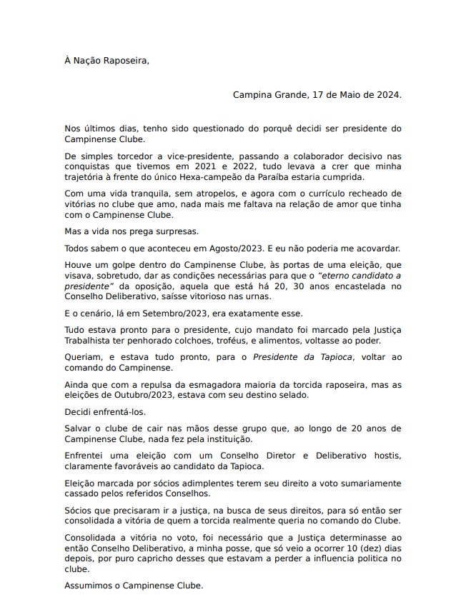 Lênin Correia não é mais presidente do Campinense. O agora ex-presidente rubro negro entregou na tarde desta sexta-feira (17) uma carta renunciando ao cargo. Confira abaixo a carta de renúncia de Lênin Correia O post Crise! Presidente do Campinense renuncia ao cargo apareceu primeiro em PB Esportes.